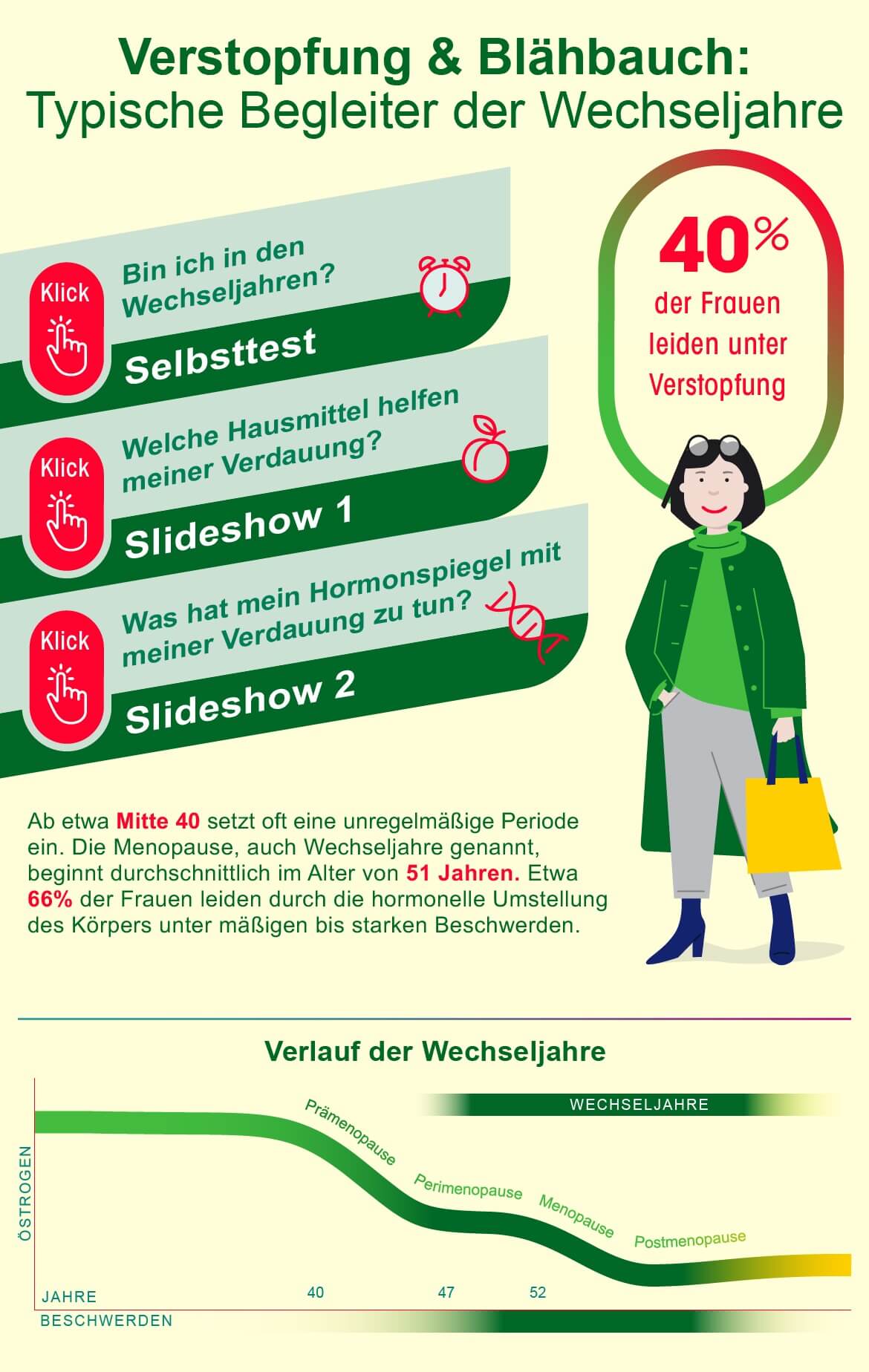 Wenn auch du an Verstopfung, Blähbauch oder anderen Magen-Darm-Problemen leidest, hilft dir folgende Infografik weiter. Zunächst hilft dir ein Selbsttest dabei, herauszufinden, ob du wirklich schon in den Wechseljahren bist. In den beiden Slideshows erfährst du außerdem, welche Hausmittel deine Beschwerden lindern können und warum der Hormonspiegel einen so großen Einfluss auf unsere Verdauung hat.